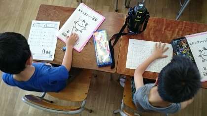 1年生が「勉強は楽しい!」と言いながら、たし算のプリントをしていました。
