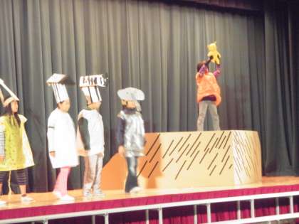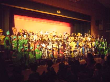 5年生は、劇「ライオンキング」です。5年生全員がライオンやハイエナなどのサバンナの動物たちのお面をかぶって、舞台を動き回ります。最後に、エルトンジョンの名曲、Can you feel the love tonight?を全員で合唱します。C−netの発音指導などもあって、難しい曲を短期間の間で、覚えることが出来ました。