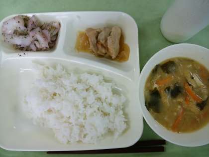 米飯・牛乳・鶏肉の甘辛焼き・みそ汁・キャベツの赤じそあえです。