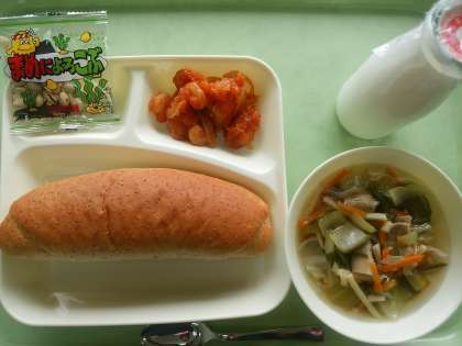 パン・牛乳・えびのチリソース・中華スープ・豆こんぶです。