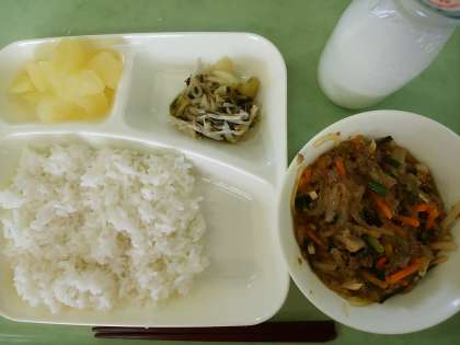米飯・牛乳・マーボー春雨・チンゲンサイともやしの甘酢和え・りんご(缶)です。