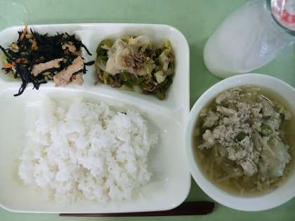 米飯・牛乳・牛肉とキャベツの炒め物・かき玉汁・枝豆入りひじきです。