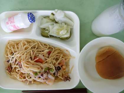 1/2パン・牛乳・シーフードトマトスパゲッティ・グリーンサラダ・発酵乳です。