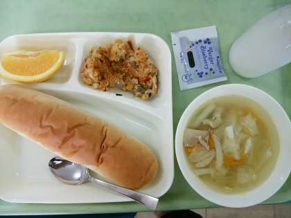パン・牛乳・パエリア・じゃがいものスープ・オレンジです。