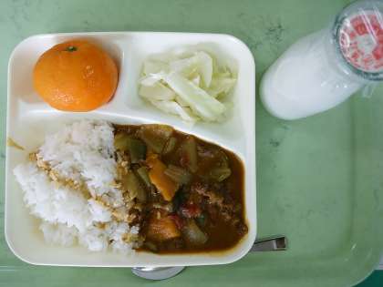 夏野菜のカレーライス・牛乳・キャベツのサラダ・みかんです。