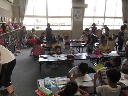 雨なので運動場に出て遊べないから、クーラーがきいていても暑苦しそうです。
