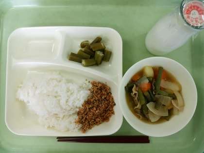 米飯・牛乳・豚肉とじゃがいもの煮物・オクラの甘酢和え・紅鮭そぼろです。