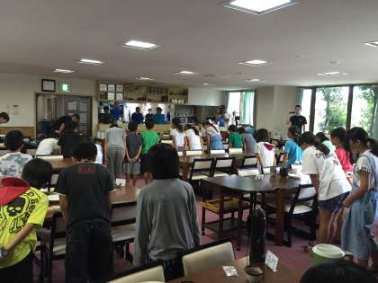 林間最後の昼食は炊き込みごはん、唐揚げ、マカロニサラダ、卵スープでした。
