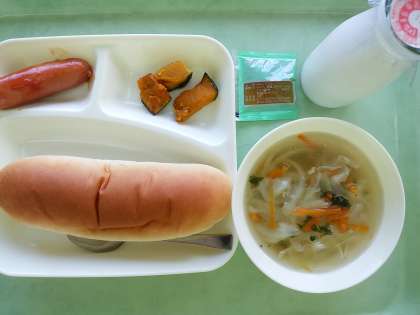 パン・アプリコットジャム・牛乳・フランクフルトケチャップソース・スープ・焼きかぼちゃです。