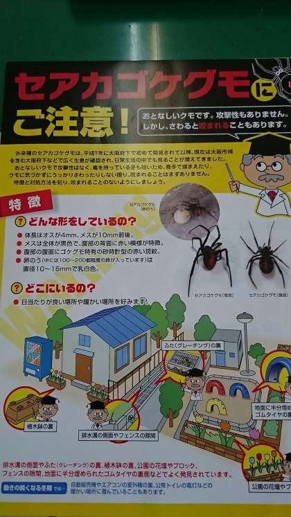 ただ、気をつけてほしいことがあります。学習園のプランターの下などに、セアカゴケグモという毒を持つクモがいる時があります。先週から数十匹のセアカゴケグモを確認し、駆除しました。おとなしいクモで攻撃性もありません。しかし、触るとかまれることもあり、注意が必要です。子ども達にも見つけた時は、決して触らないように指導しています。