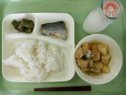 米飯・牛乳・さごしの塩焼き・じゃがいもと一口がんもの煮物・オクラのおかか炒めです。