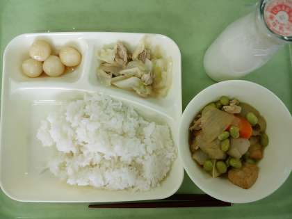 13日の献立は「お月見」にちなんだ行事献立です。地域によっては、月に見立てられた様々な丸い物が食されています。大阪市は里芋と団子が登場しました。