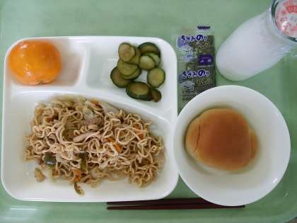 パン・牛乳・焼きそば・きゅうりの辛みづけ・みかんです。