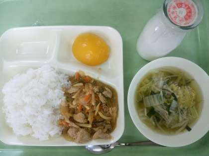 ピリ辛丼・牛乳・中華スープ・黄桃です。