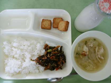 米飯・牛乳・もずくと豚ひき肉のジューシー・五目汁・厚揚げの生姜醤油かけです。