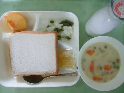 パン・牛乳・コーンクリームシチュー・キャベツと三度豆のサラダ・柿です。