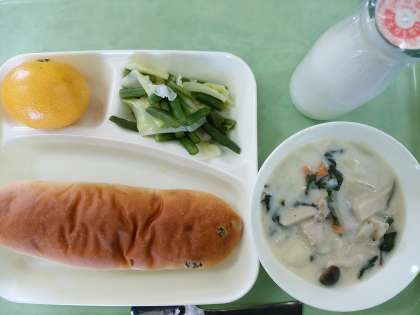 パン・牛乳・きのこのクリームシチュー・キャベツと三度豆のサラダ・みかんです。