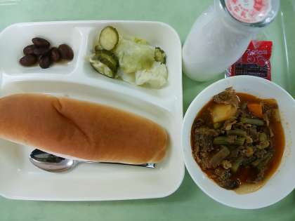 パン・牛乳・牛肉と野菜の洋風煮・キャベツときゅうりのサラダ・うずら豆のグラッセです。