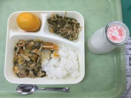 中華丼・もやしの中華あえ・みかん・牛乳です。