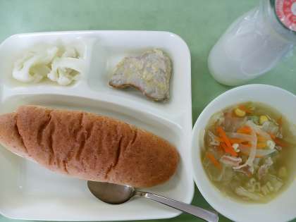 パン・牛乳・かつおのガーリックマヨネーズ焼き・マカロニと野菜のスープ・カリフラワーのサラダです。