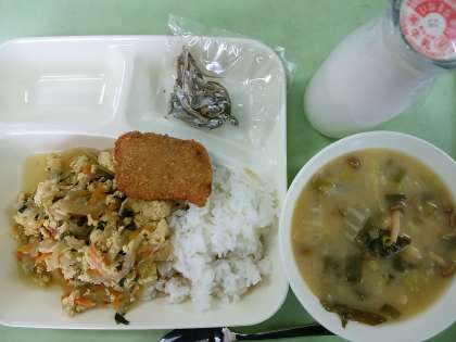 カツ丼・牛乳・なめこのみそ汁・ミニフィッシュです。
