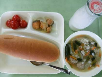 パン・牛乳・鮭のマリネ・肉団子の麦のスープ・プチトマトです。