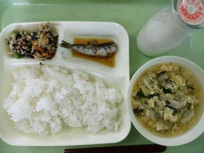 米飯・牛乳・鰯の生姜煮・かき玉汁・高野豆腐の炒り煮です。