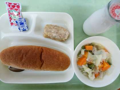 パン・牛乳・豆腐ハンバーグ・スープ煮・固形チーズです。