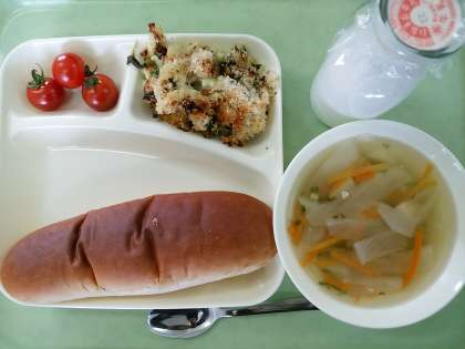 パン・牛乳・ホタテ貝のグラタン・大根のスープ・プチトマトです。