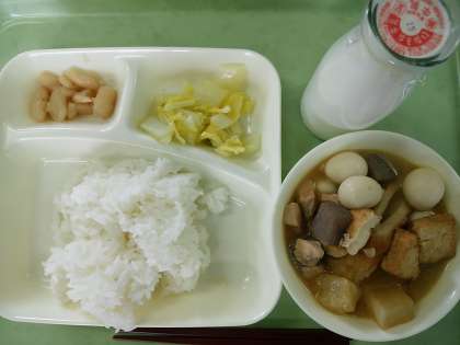 米飯・牛乳・関東煮・白菜の甘酢漬け・大福豆の煮物です。