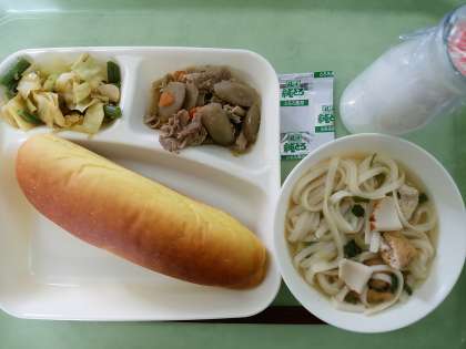 パン・牛乳・豚肉とごぼうの煮物・なにわうどん・とろろ昆布・キャベツと三度豆の胡麻和えです。