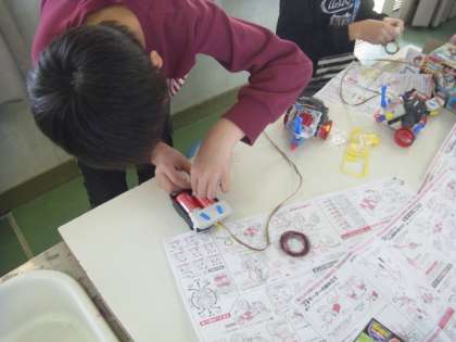 今、5年生は、理科で「電流のはたらき」の単元を学習しています。その教材として、電磁石で動くロボットを作りました。悪戦苦闘しながら、出来上がったロボットをコントローラーで動かして、サッカーをして楽しみました。