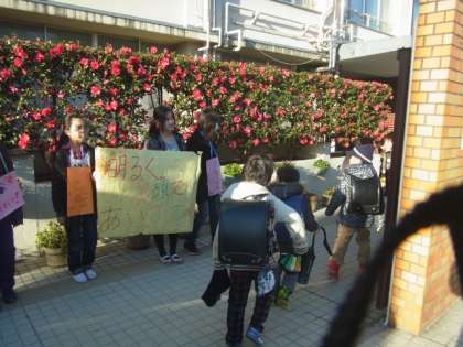2月5日(水)、早朝から小雪が舞い散る寒さの中で、児童会の委員長が中心になって正門と西門に立って、元気な声で登校してくる児童にあいさつをしていました。