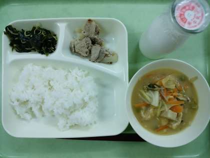 米飯・牛乳・豚肉の生姜焼き・みそ汁・じゃこわかめです。