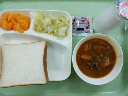 パン・いちごジャム・牛乳・ビーフシチュー・キャベツのピクルス・みかんです。