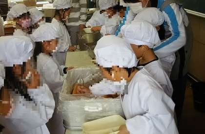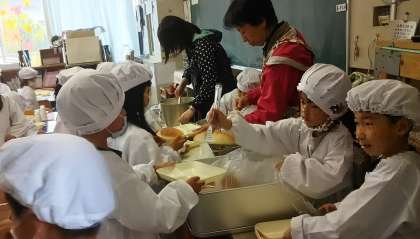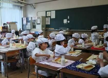 給食が始まってまだ2週間しか経っていないのに、ずいぶんとお当番の仕事が上手になりました。みんなで協力して、ささっと用意ができましたね。