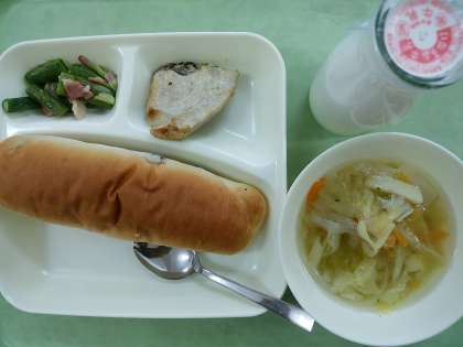 パン・牛乳・鰹のガーリックマヨネーズ焼き・スープ・グリーンアスパラガスのソテーです。