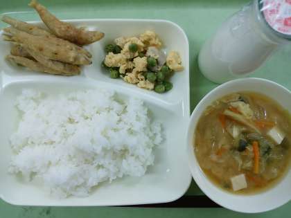 米飯・牛乳・きびなご天ぷら・みそ汁・えんどうの卵とじです。