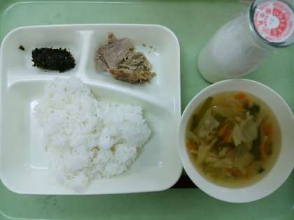 米飯・牛乳・豚肉のゴマみそ焼き・すまし汁・海苔の佃煮です。