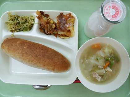 パン・牛乳・鶏肉と野菜のスープ煮・カレーソテー・ミックスフルーツのクラフティです。