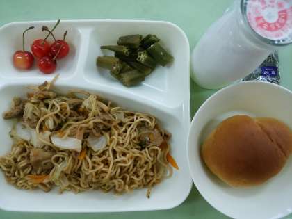 1/2パン・牛乳・焼きそば・オクラの中華和え・さくらんぼです。