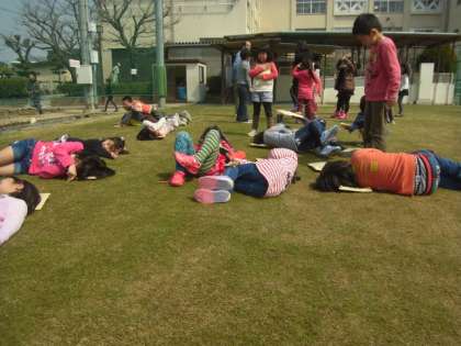3月17日、休み時間、一年生が授業中にいらなくなった封筒と新聞で枕を作りました。休み時間に芝生で使いました。春の日差しに包まれて穏やかな時間を過ごせました。