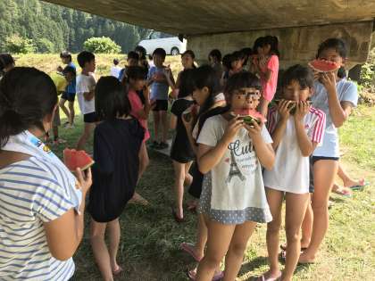 おやつは、スイカでした。 みんないい顔してます。 ひんやりおいしかったです。