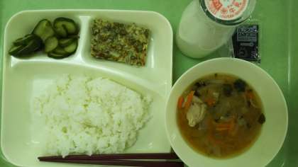 米飯・牛乳・お好み焼き・豚汁・きゅうりの海風味です。