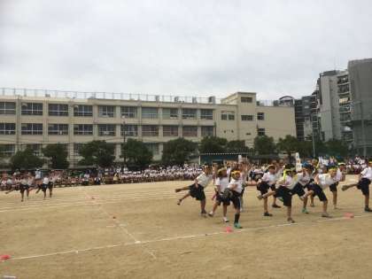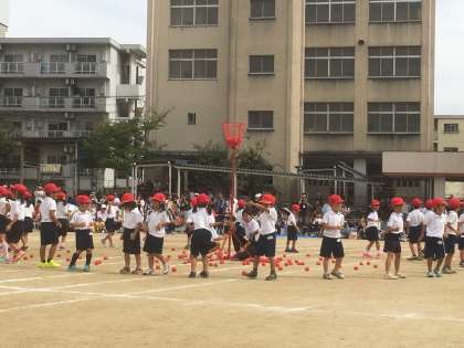 団競の「ニンニン忍者 玉入れの術」では、高いかごに入れるのは大変でした。それでも赤白ともに60個以上入れることができました。途中のダンスもかわいいかったです。