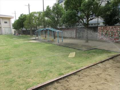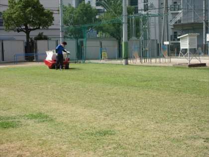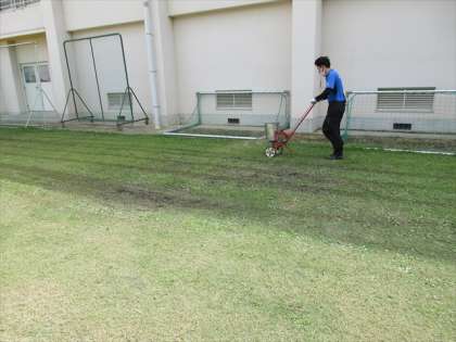 種まきの後、土をかけ、水分を与えています。今日から2,3週間は、芝生立ち入り禁止になります。種から芽が出て、芝が成長するのを待ちます。これから、緑色の芝生に変わっていくのを楽しみにしましょう。