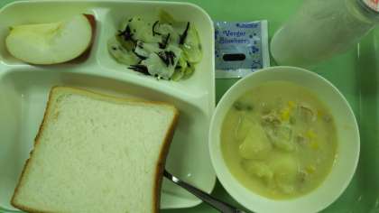 パン・ブルーベリージャム・牛乳・コーンクリームシチュー・キャベツのひじきドレッシング・りんごです。