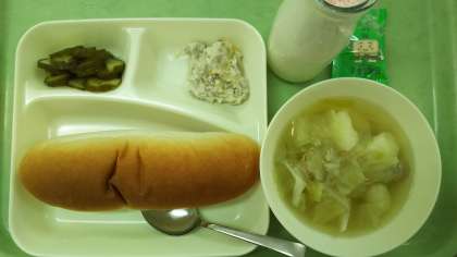 パン・ソフトマーガリン・牛乳・鶏肉のマリネ焼き・スープ煮・きゅうりのピクルスです。