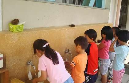 遊んだあとは、しっかり手洗い、うがいをしていた1年生です。