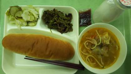 今日の給食 公開日 2017/10/24 更新日 2017/10/24 給食 24日の献立は、 パン・牛乳・牛肉のカレー風味焼き・トマトのスープスパゲッティ・キャベツときゅうりのピクルスです。 エネルギー613kcal たんぱく質28.0g 脂質20.0g いいね(0)